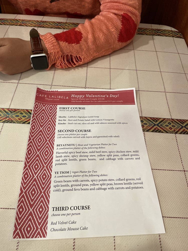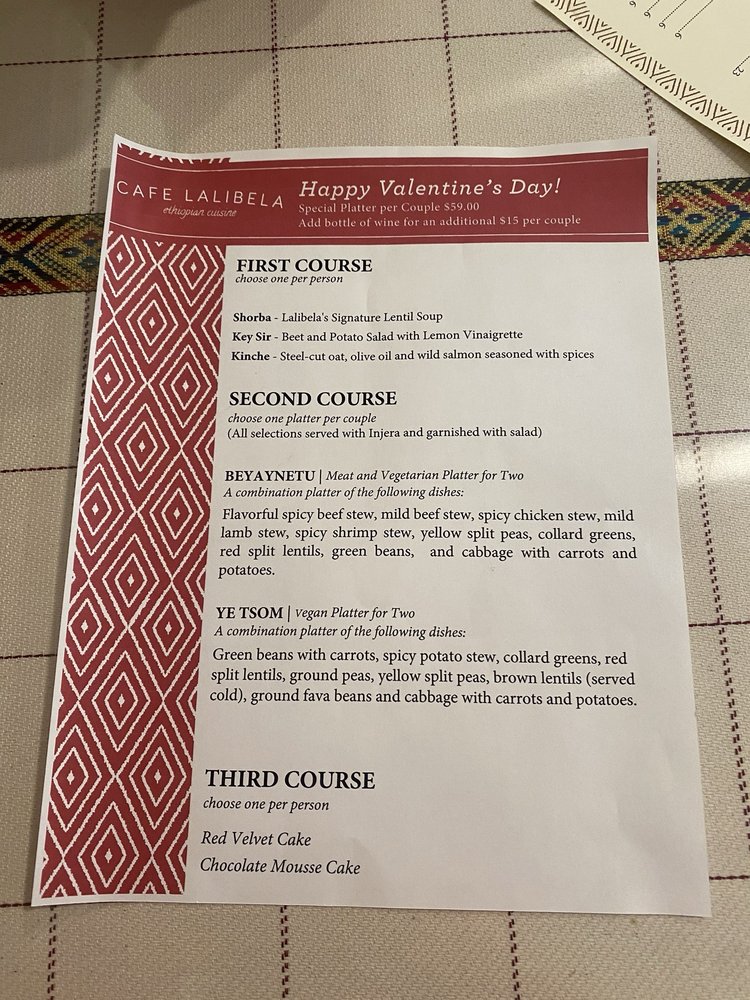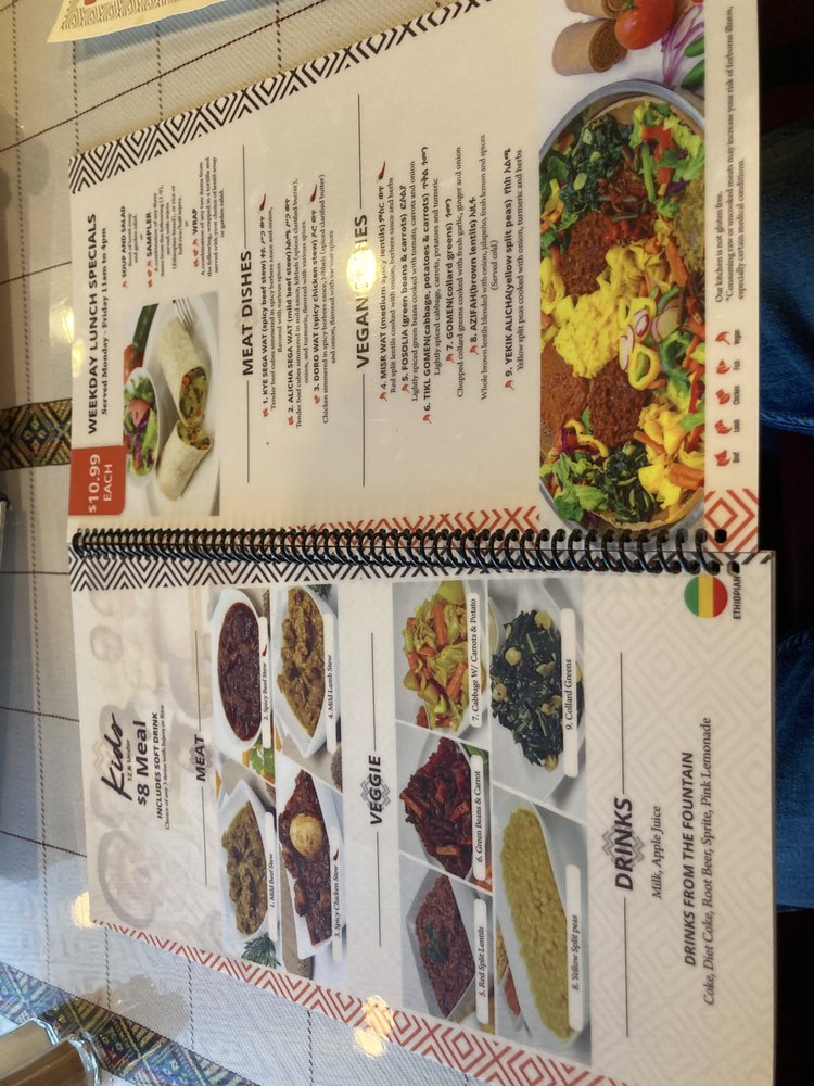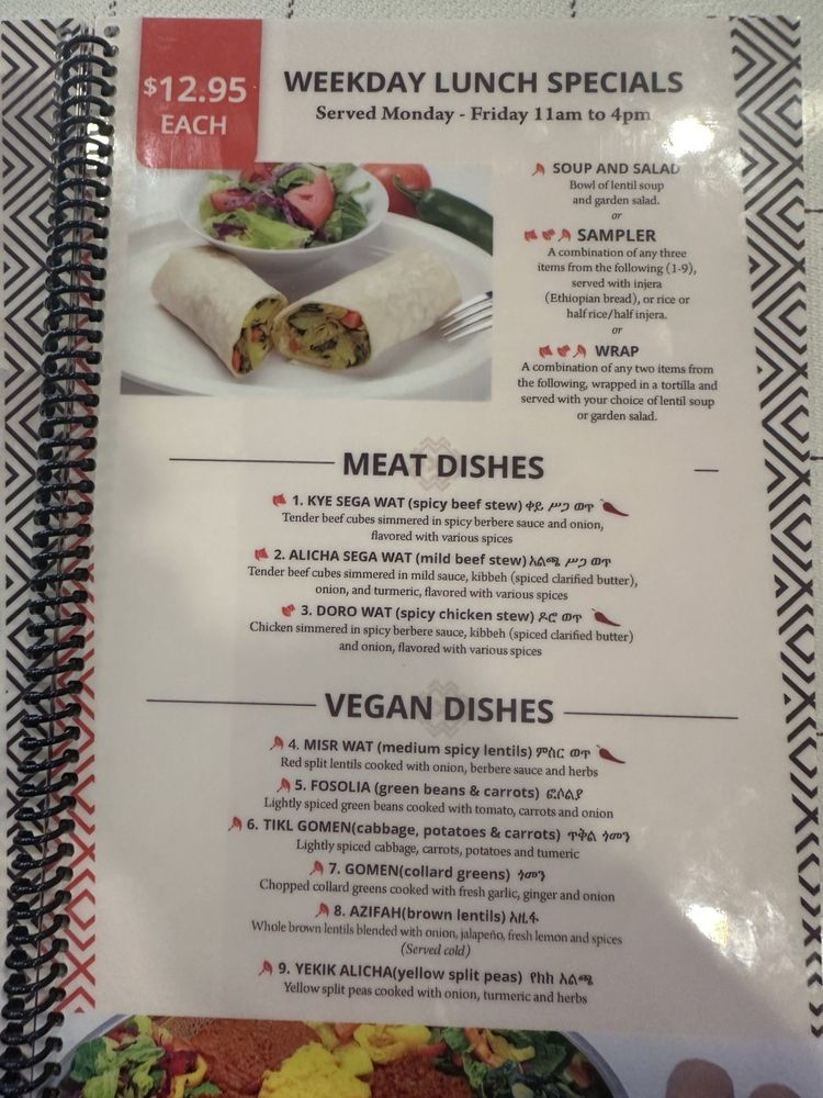 For parties of 2. A combination of alicha sega wat, doro wat, key sega wat, yebeg alicha, fosolia, gomen, misr wat, tikil gomen, yekik alicha. Served with injera and garnished with salad.